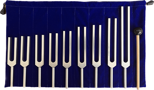 A tuning fork set with several forks at different frequencies is a common choice for practitioners using unweighted forks.
